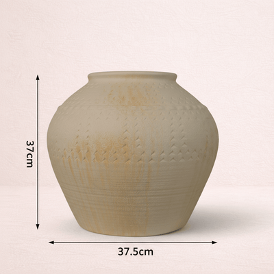 A rounded jar-form planter with a broad shoulder, clean rim, and subtle hand-carved detailing across the surface. Finished in a soft ivory-beige tone with gentle tonal variations, it brings a warm, artisanal elegance to modern, boho, and minimal interiors.